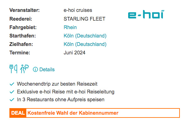 Kulinarische Genüsse ohne Aufpreis in 3 Restaurants, gemütliche Kabinen mit absenkbaren Panoramafenstern und eine stets zur Seite stehende e-hoi Reiseleitung machen deine Auszeit auf dem Rhein perfekt.